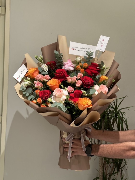 (ولاننا نتعامل مع أزهار بعضها قد تكون موسمية في حال نفاذها سيتم التواصل معكم ونعدل ونخليه احلى من الصورة 😉)